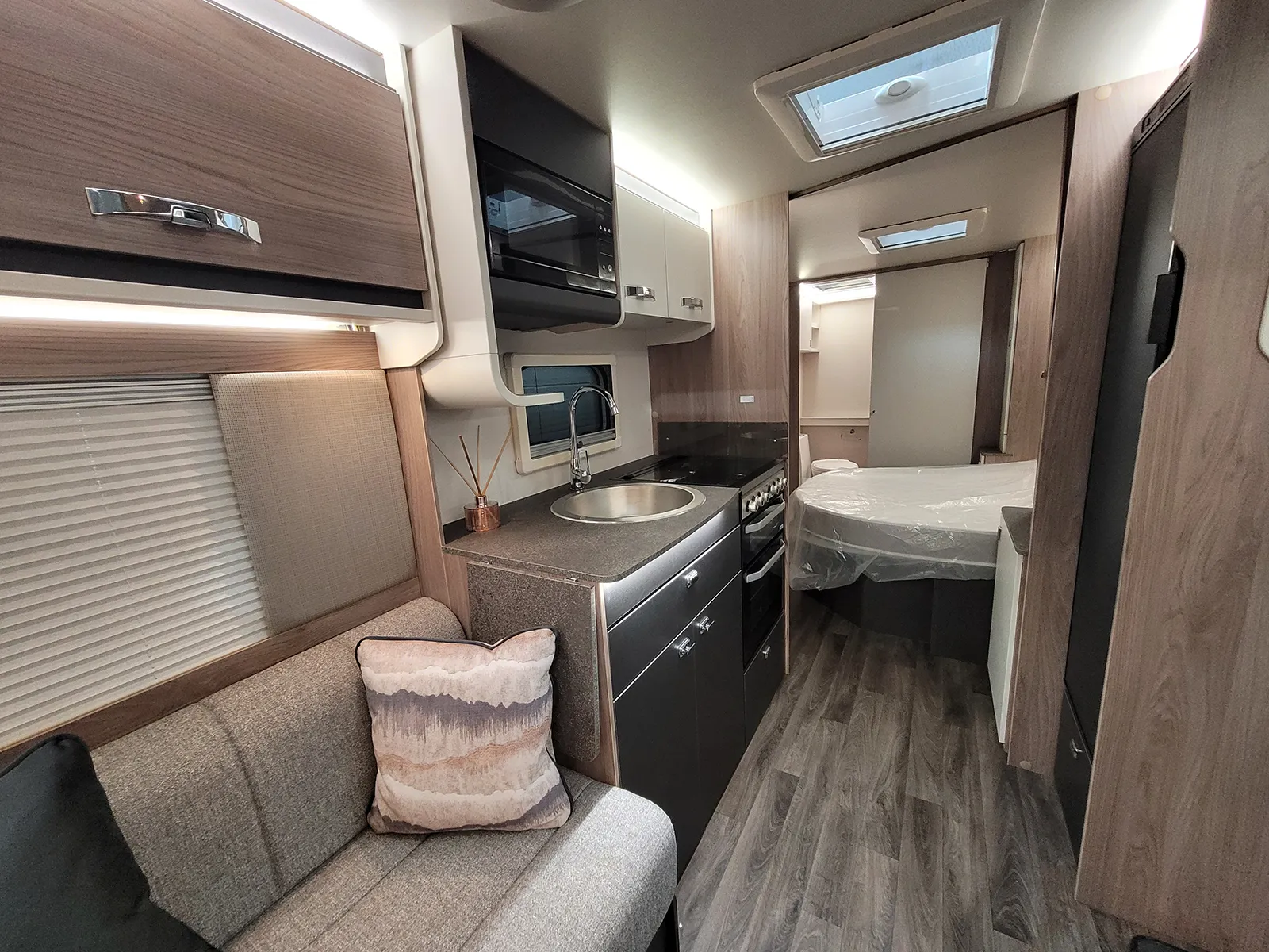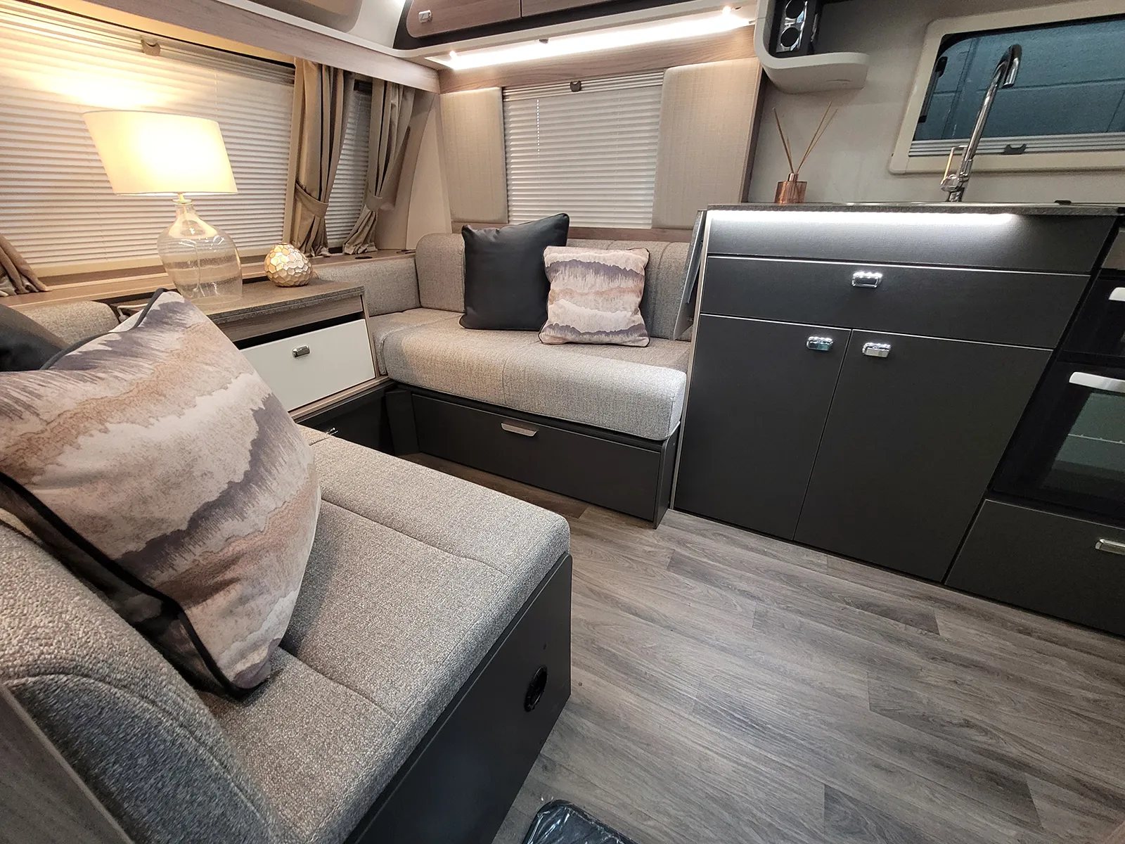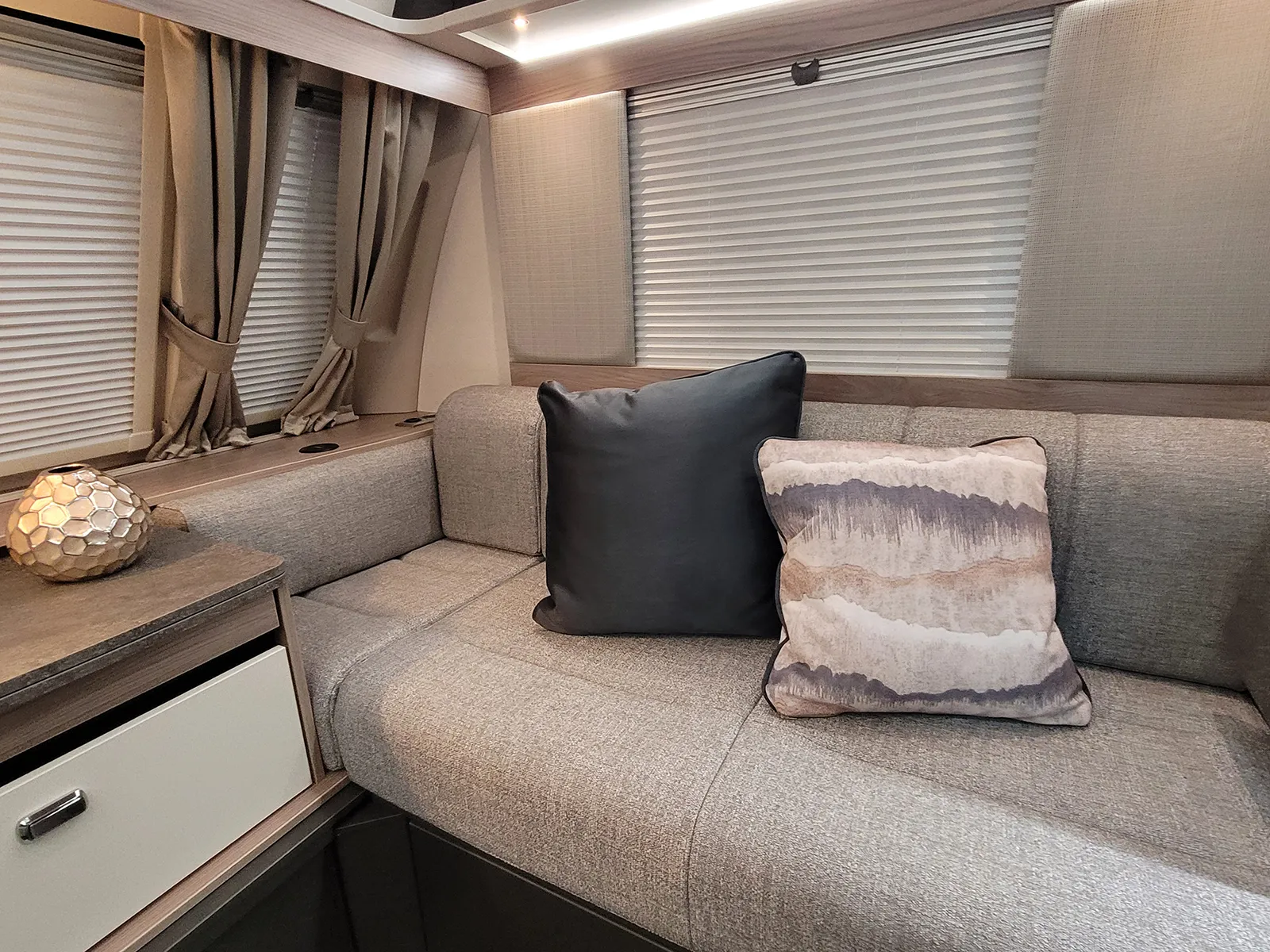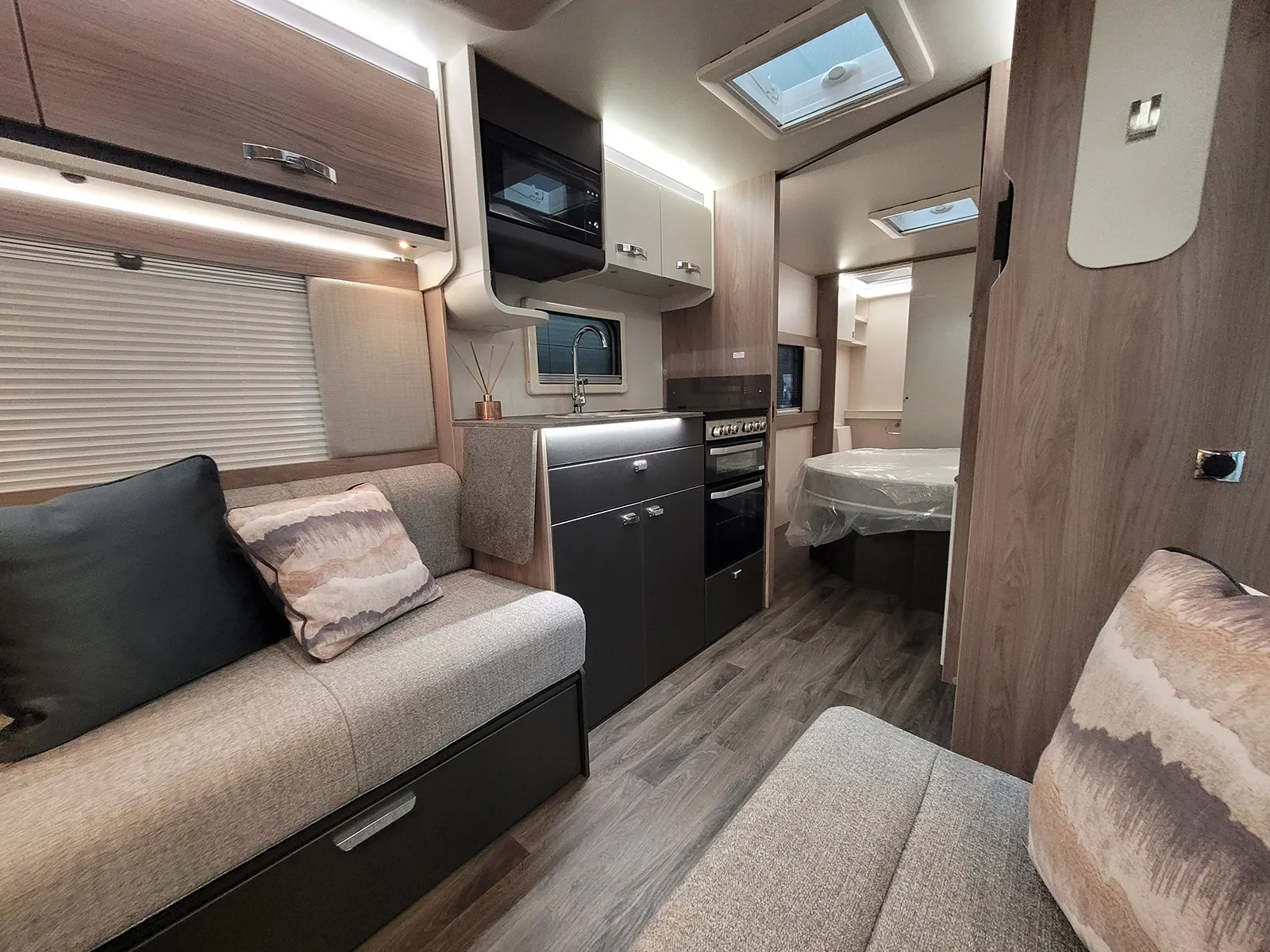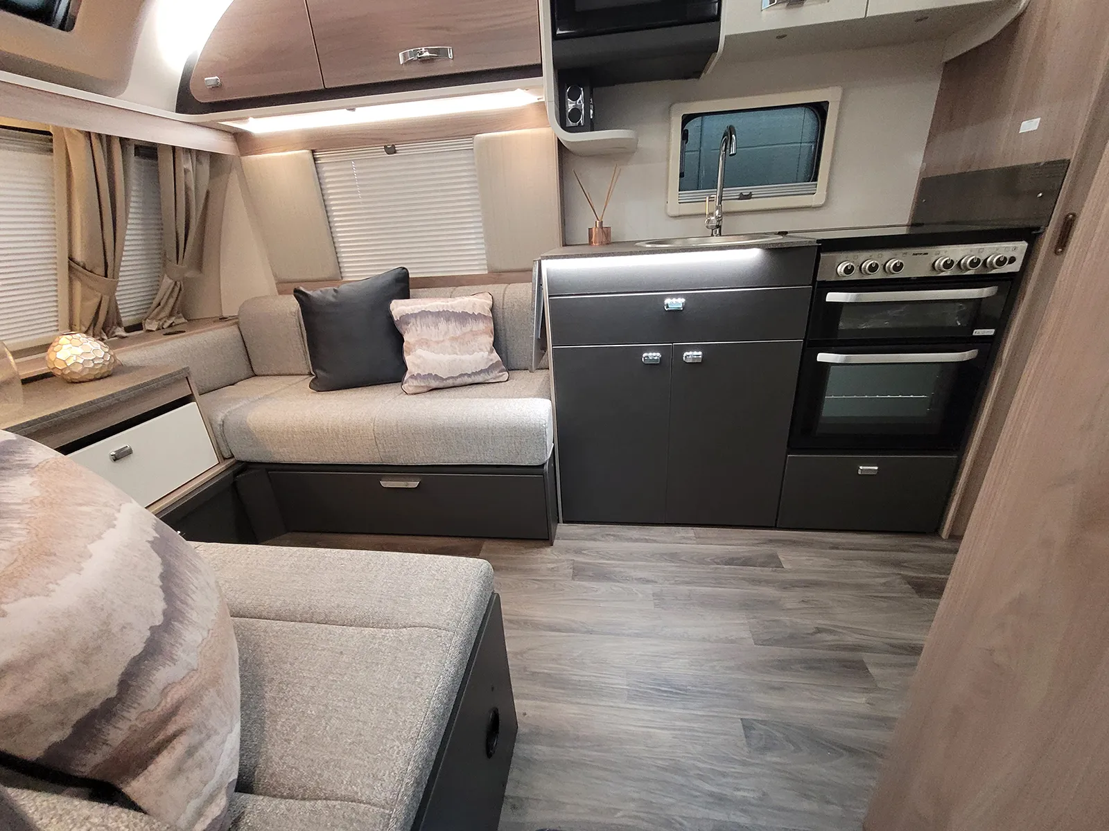 Features | 25 metre hook up cable, AL-KO AKS 3004 stabiliser, ATC, Awning Light, Blinds/flyscreen, Branded DAB radio with USB connection point and bluetooth capibility, Carbon Monoxide Alarm, Door flyscreen, Duel fuel heating Truma Combi Boilier, Ecocamel Jetstorm shower head, Freestanding table, Microwave Oven, One key high security locks, Sectioned removable carpets, Smoke alarm, Spare Wheel, Stainless steel kitchen sink, Thetford Thermostatic oven & grill with 3 burner gas hob & 1 electric hot plate |